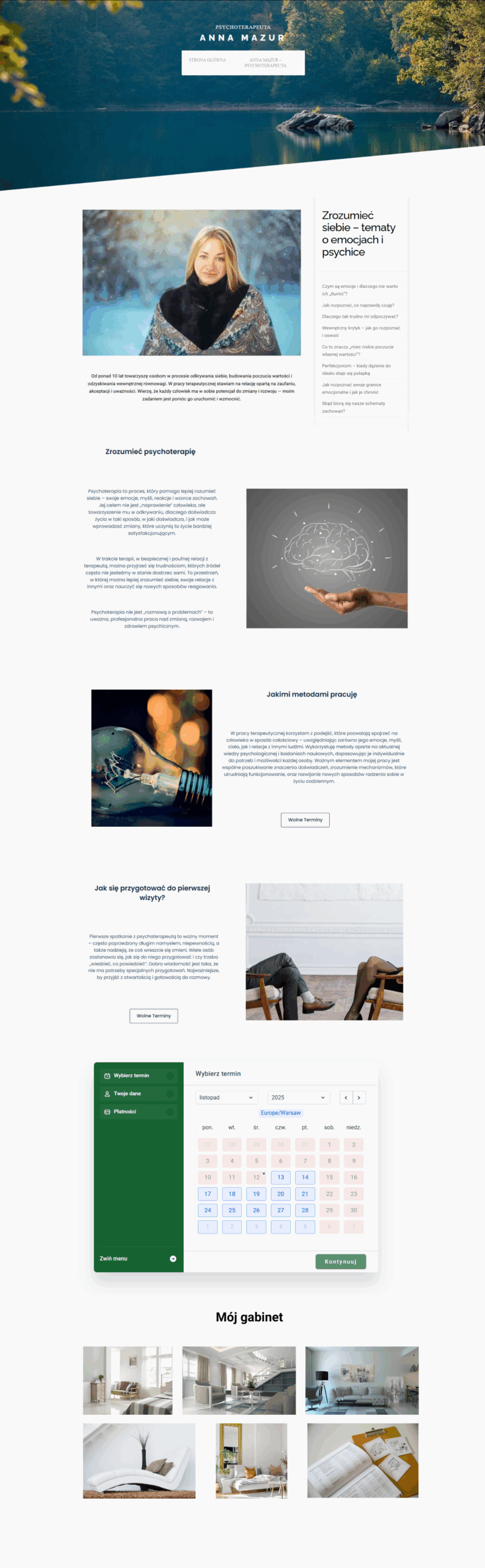 Projekt strony internetowej stworzony dla psychoterapeutki, specjalizującej się w terapii indywidualnej i wsparciu emocjonalnym dorosłych. Celem było zaprojektowanie spokojnej, przejrzystej i budzącej zaufanie witryny, która pomoże potencjalnym pacjentom łatwo znaleźć informacje o ofercie, metodach pracy oraz możliwościach kontaktu.