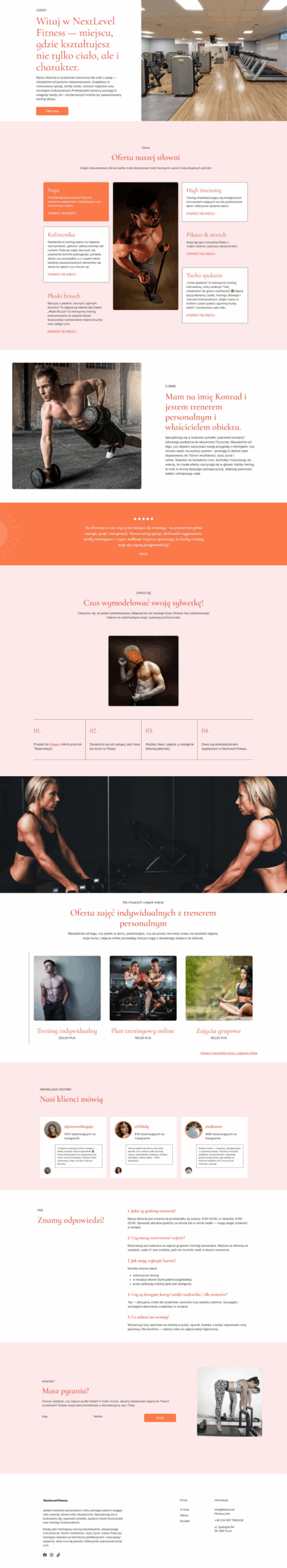 Strona internetowa zaprojektowana dla nowoczesnej siłowni, oferującej zajęcia fitness, treningi personalne i dostęp do strefy wellness. Celem projektu było stworzenie dynamicznej, przejrzystej witryny, która oddaje energię marki, a jednocześnie ułatwia użytkownikom zapisanie się na zajęcia i poznanie oferty klubu.